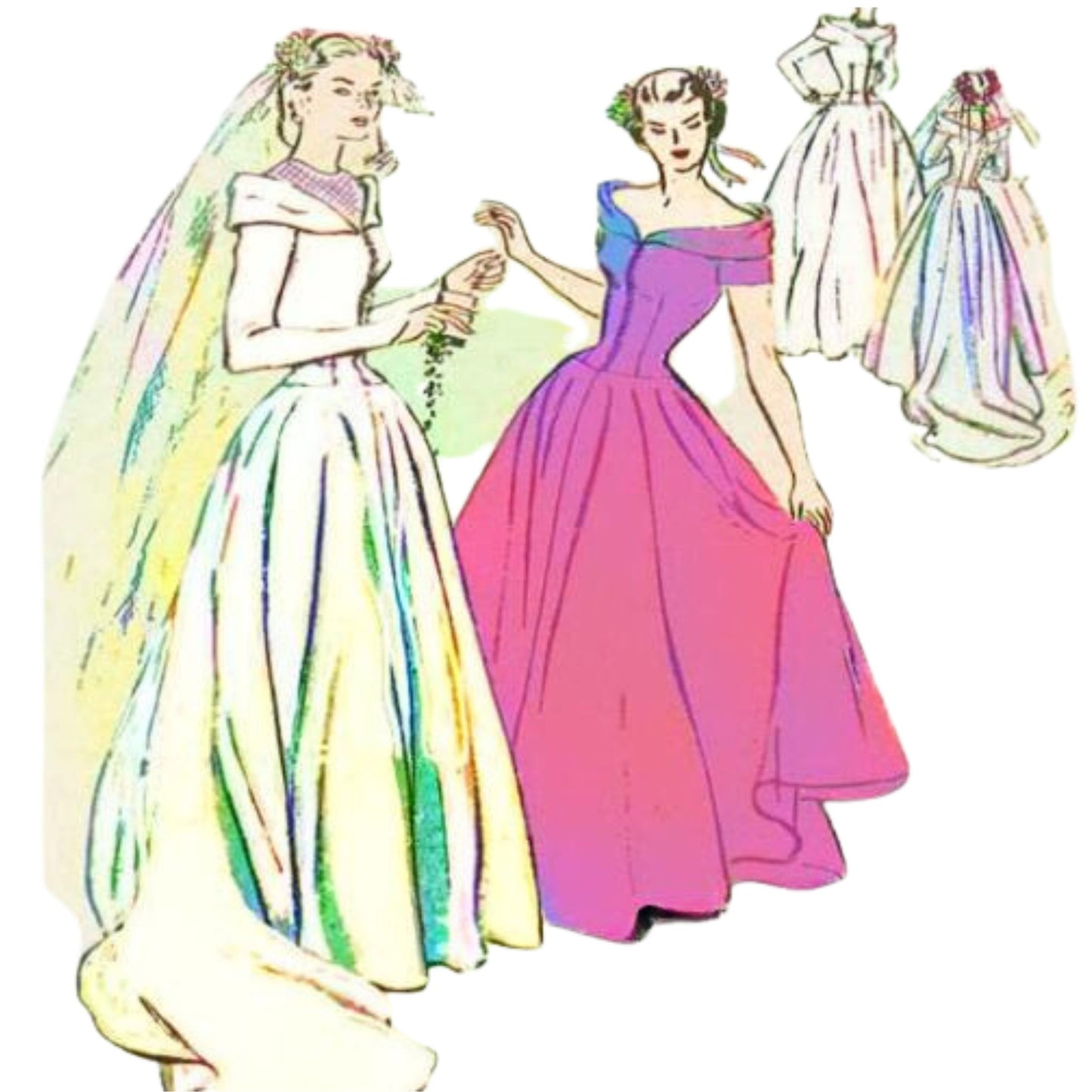 Bouffantes Brautkleid mit Schleppe. Das königliche Hochzeitskleid hat einen schulterfreien Ausschnitt, der von einer Bertha-Manschette umgeben ist. ein reines Joch; tailliertes Oberteil mit Knopfbesatz; lange Ärmel. Der fünflagige, bauschige Rock geht in eine kurze Schleppe über. (B) Brautjungfernkleid. (C) Ärmelloses Abendkleid.