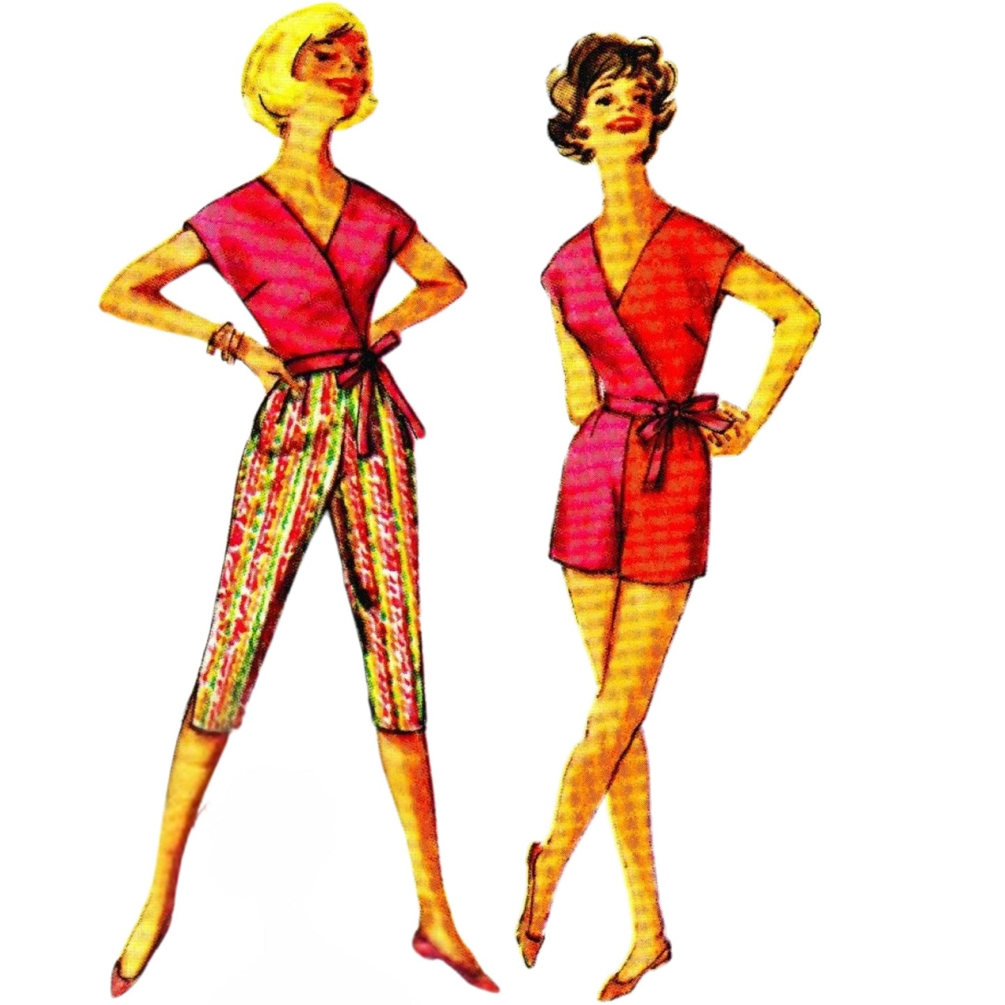 Die kragenlose Wickelbluse hat ein Hauptschnittteil. Sie hat sehr leichte Kappärmel, einen Taillenbund und Bindebänder. Der geraffte Rock, V.1, hat eine durchgehende Frontöffnung. Die Hose hat einen Reißverschluss auf der linken Seite und eine Tasche in der rechten Seitennaht. Die Hose V. 2 reicht bis unter das Knie mit Schlitzöffnungen an den unteren Kanten der Seitennaht. Die Hose V. 3 ist kurz.