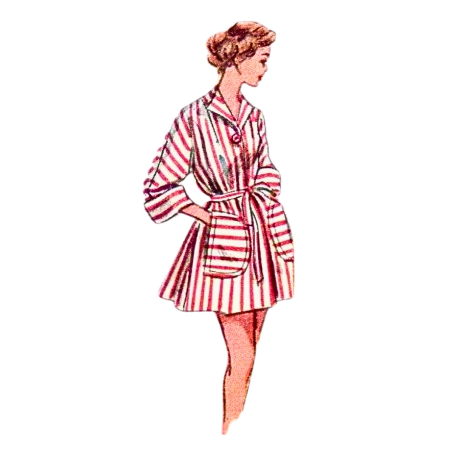 Der Badeanzug ist mit einem enganliegenden BH gestaltet, der mit einem Prinzessinnenlinienrock verbunden ist. Eine Schleife befindet sich in der Mitte vorne, und die Träger sind in einem Stück mit Vorder- und Rückenteil geschnitten. Der Jersey-Futter hat einen elastischen Bund an den Beinen. Der Strandmantel hat Kimonoärmel, aufgesetzte Taschen, einen Knopfverschluss und einen eigenen Gürtel. Ansicht 1 besteht aus kontrastierendem Stoff und hat Manschetten. Ansicht 2 ist mit dem Stoff des Badeanzugs gefüttert.