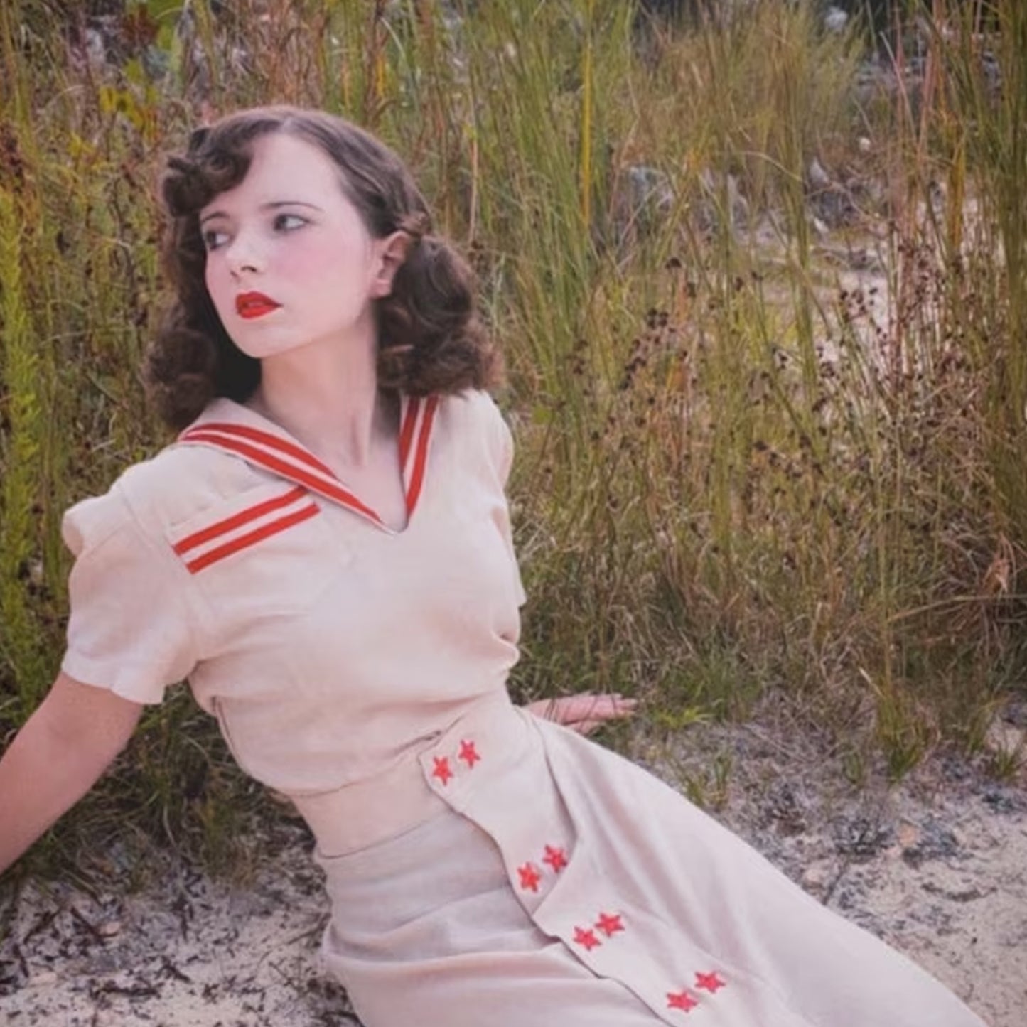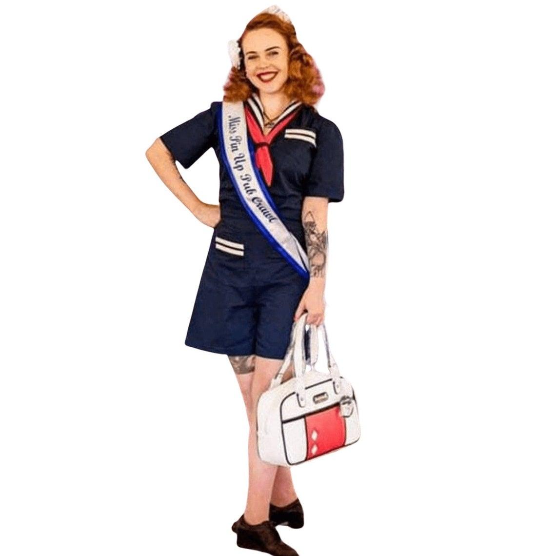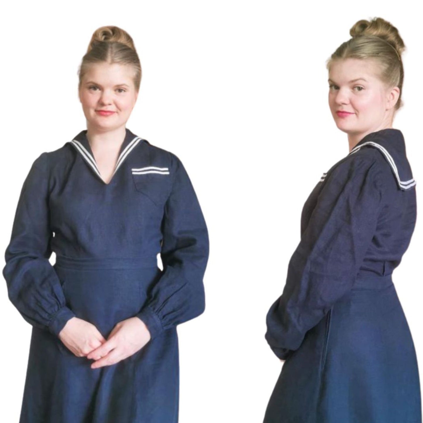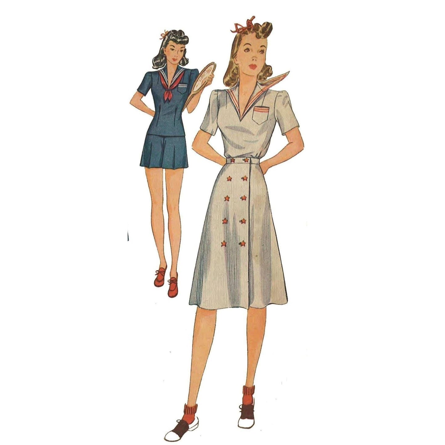 Ahoi, meine Damen! Perfektes nautisches Playsuit-Muster aus den 1940er Jahren für Ihre Retro-Garderobe! Diese schwer zu findende Schönheit zeichnet sich durch folgende Merkmale aus: Die Bluse ist an Schultern und Taille mit Abnähern versehen. Der Hals ist verdreht und mit angesetztem Kragen versehen, der weggelassen werden kann. Die Ärmel sind oben mit Abnähern versehen, die langen Ärmel sind bis zum Taillenbund gerafft. Die Shorts sind hinten mit Abnähern versehen und an den Seiten geknöpft. Der fünfteilige Rock ist mit einem geraden Gürtel und Knöpfen vorne versehen.