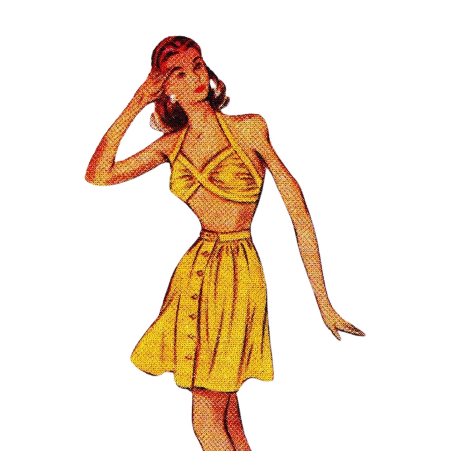 Sun, sea, and vintage style! You will definitely be noticed in this halter-neck brassiere top, high-waisted bikini shorts, and swishy button-front skirt are your ticket to a perfectly chic holiday wardrobe. Just add sandals and a cocktail!
