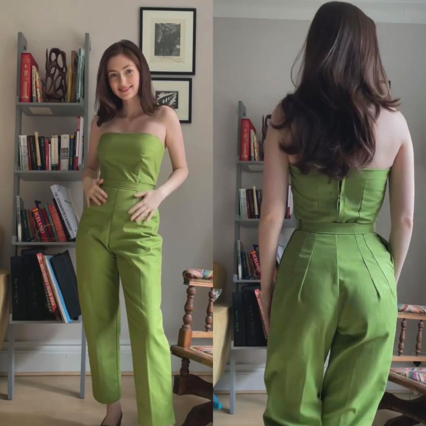 Both skirt and pants are styled with side zipper. Skirt, proportioned in length, has front waistline pleats and back kick pleat. Pants are proportioned both in crotch length and leg length. Slim pants have right side seam pocket and side seam openings.