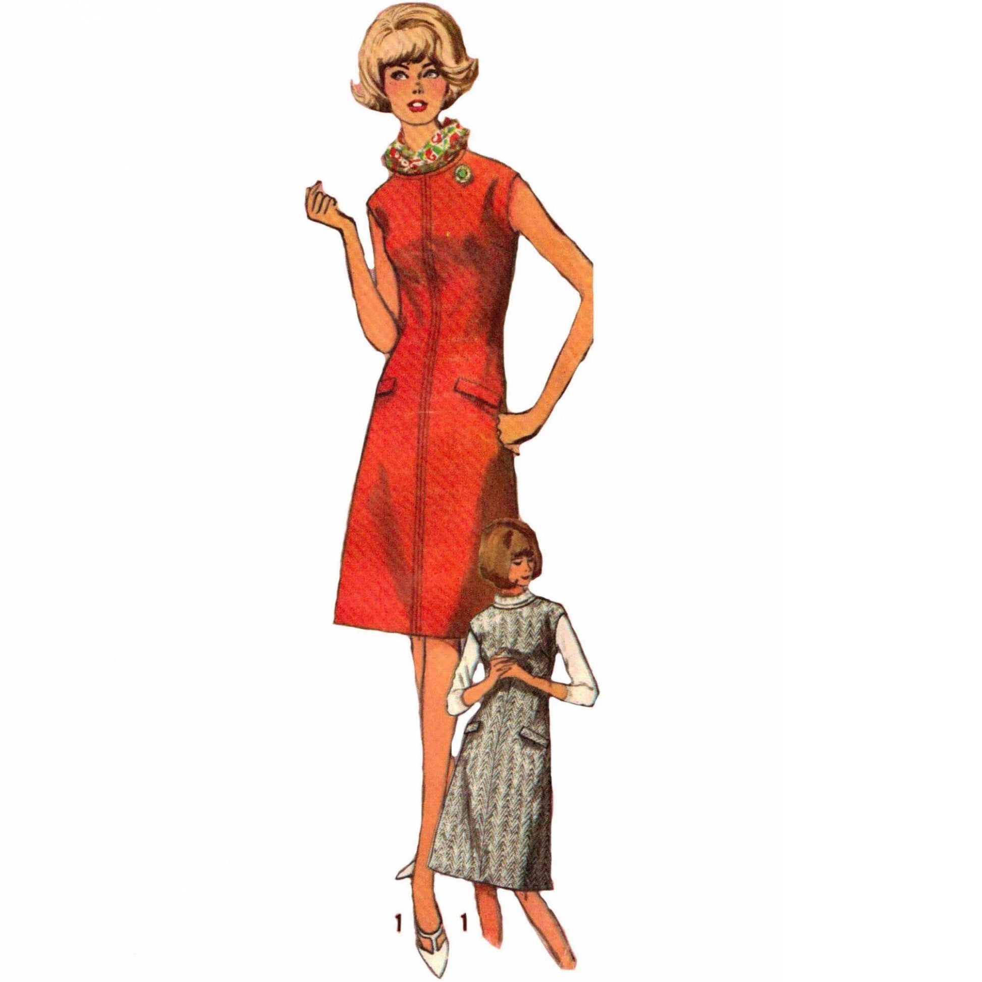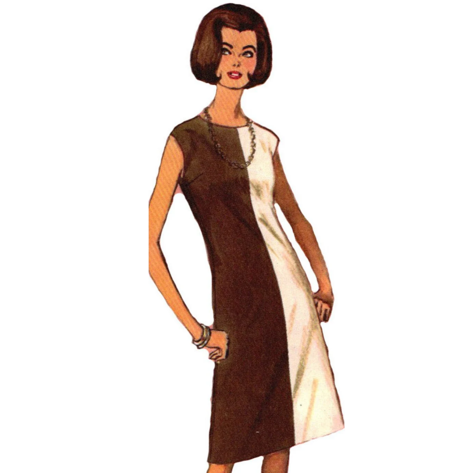Dress has slightly lowered round neckline, extended shoulder lines, back zipper closing and optional top-stitching trim. V.1 has flap trim. Right front and back of V.2 contrast left front and back.