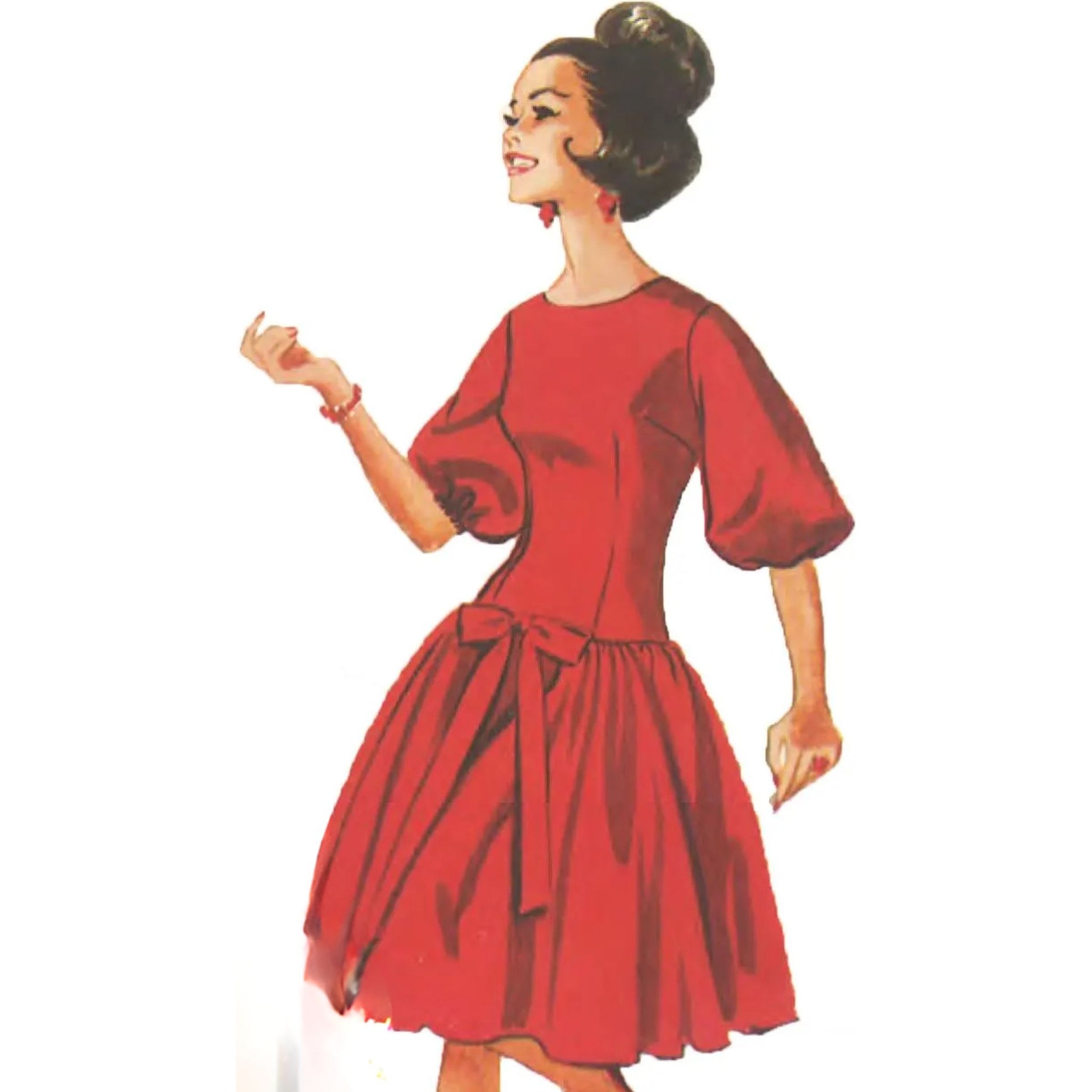 This dress pattern comes in two lengths. The long torso dress has a dart fitted bodice and a four-piece gathered skirt in long or short length. The long dress is sleeveless and may be made in one or two fabrics. The short dress has set-in sleeves with elastic in the hems at the lower edges. The applied bow at the front may be of bodice fabric or ribbon. The dress also has centre back zipper.
