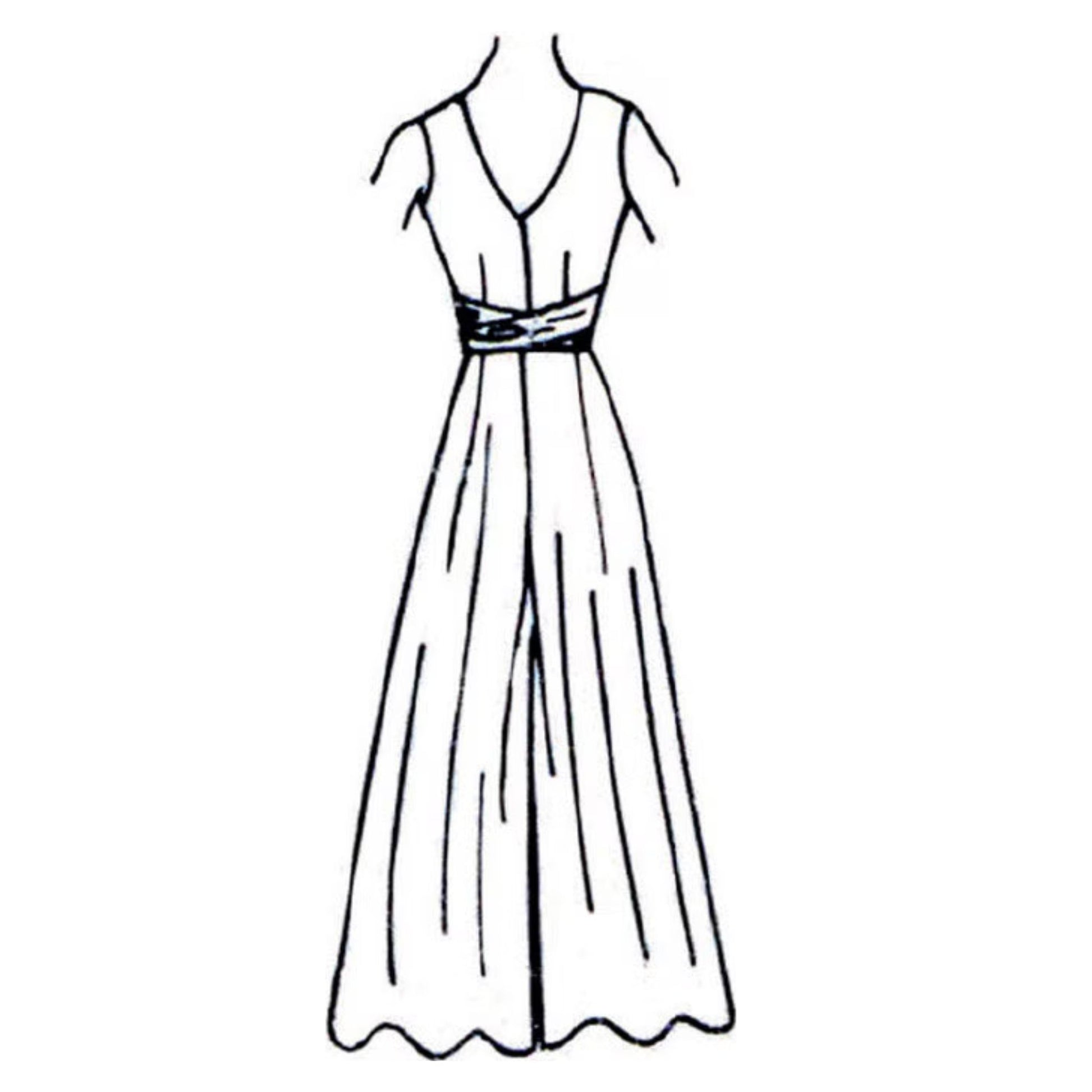 Cette combinaison fabuleuse présente un décolleté arrondi, une taille cintrée avec pinces et un pantalon à jambes larges avec ceinture à nouer.