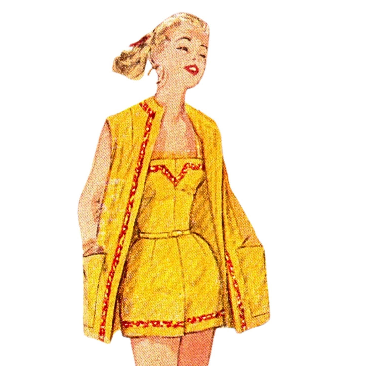 Le corsage ajusté est entièrement recouvert. Les bretelles, facultatives, se croisent au centre : dos et s'attachent devant. Le manteau sans manches est carré et possède deux grandes poches plaquées. Vue 1, les shorts froncés ont une enveloppe élastique sur le bord inférieur. Une bordure en biais contrastée se trouve sur le bord supérieur du corsage. Le manteau est également contrasté. Vue 2, le short est ajusté. Les bords du manteau et de la combishort sont bordés de ruban brodé.