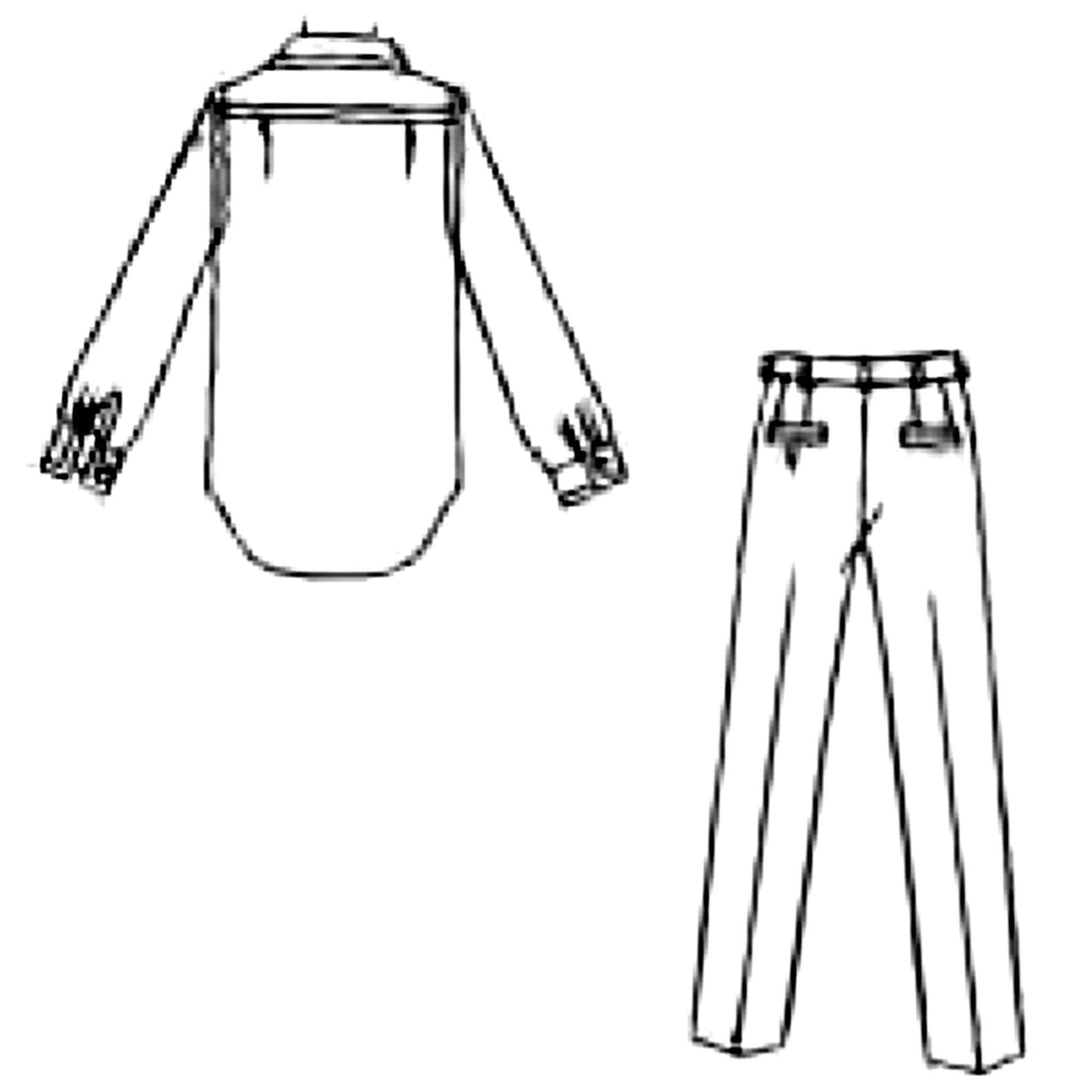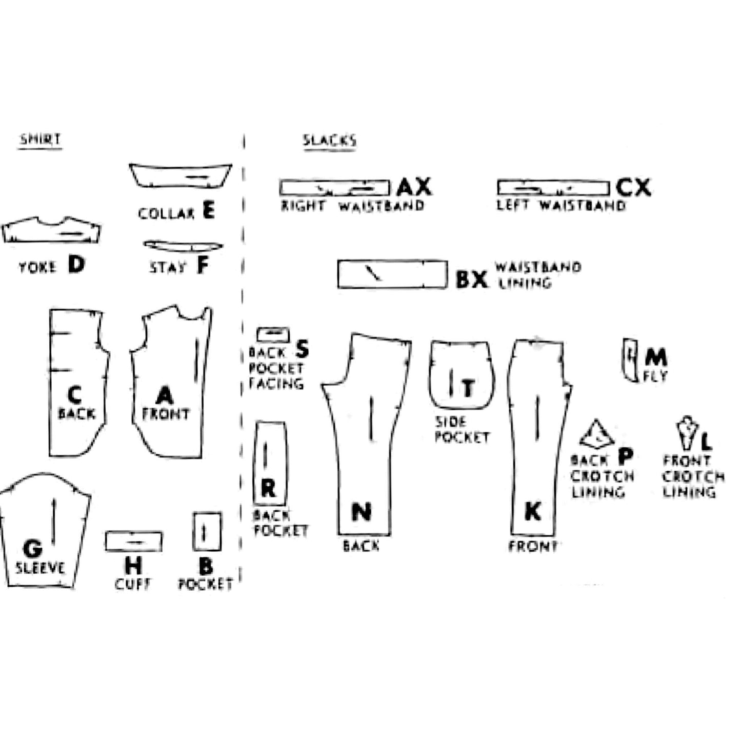 Chemise : Deux boutons 3/8" (opt.), dix boutons ½". Pantalons : fermeture à glissière de type braguette de 11", fermeture à crochet et œillet, un bouton de ½".