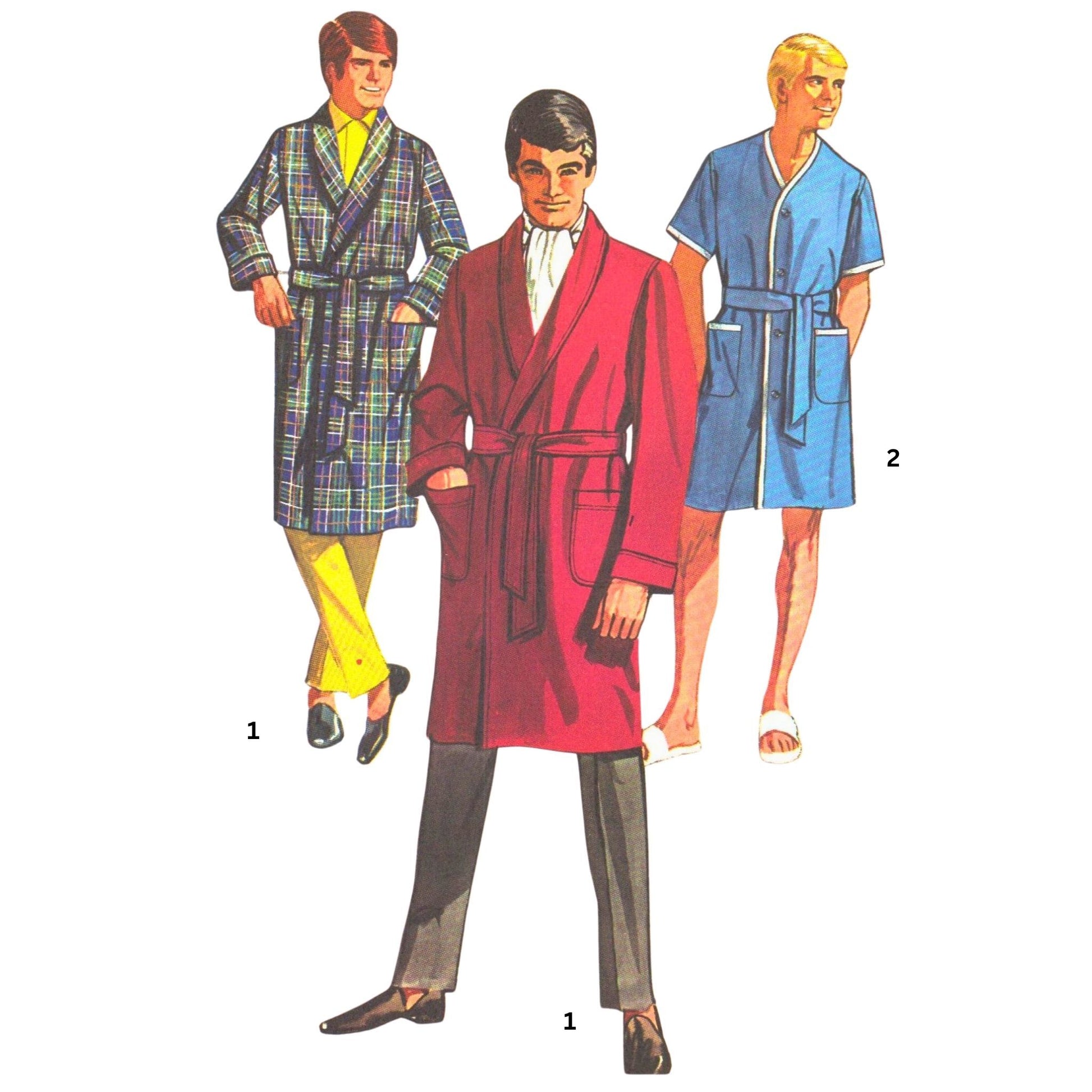 La vestaglia ha maniche inserite, tasche applicate, passanti in tessuto e cintura da annodare. Lunghezza fino al ginocchio. La V.1 ha collo sciallato, maniche lunghe a due pezzi con polsini in tessuto e cuciture decorative opzionali. La V.2 senza collo, di lunghezza più corta, ha chiusura frontale con bottoni, maniche corte e rifinitura con treccia a contrasto.