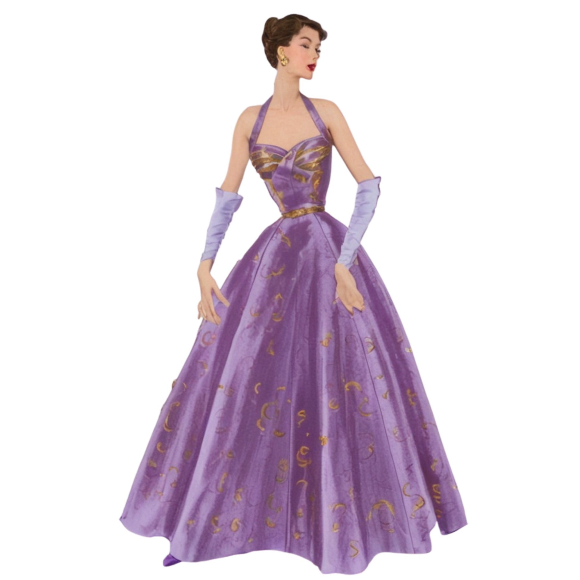 Questo bellissimo abito Vogue presenta una gonna ampia a otto gonne in due lunghezze che si unisce al corpetto aderente in vita. Il lato destro del davanti del corpetto si estende sulla pienezza del busto arricciato. Fascia per il collo all'americana. Chiusura centro-dietro con cerniera lampo.