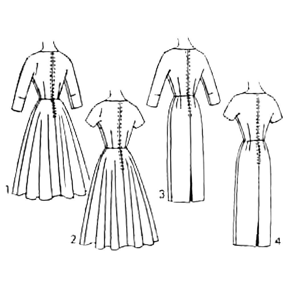 「ソーイージー」背景ドレスは、スリムスカートまたは4ピースのフレアスカートの選択が可能です。ボディと袖が一体化…ノッチ付きバトーネックライン…リボントリムは開き部分です。七分袖または半袖。(VI-V2)。フレアスカート付きドレス – 他の長さの袖。(V3-V4)シースドレス…ヒップに折り目が解放されたスリムスカート – どちらの長さの袖でも。