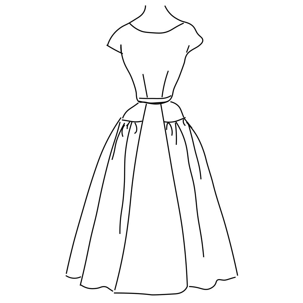 ウェアラブルでフェミニン。ソフトなドレープが施されたボディスは、低いネックラインのタブで留められています。スカートのふくらみは両側とも腰の高さです。