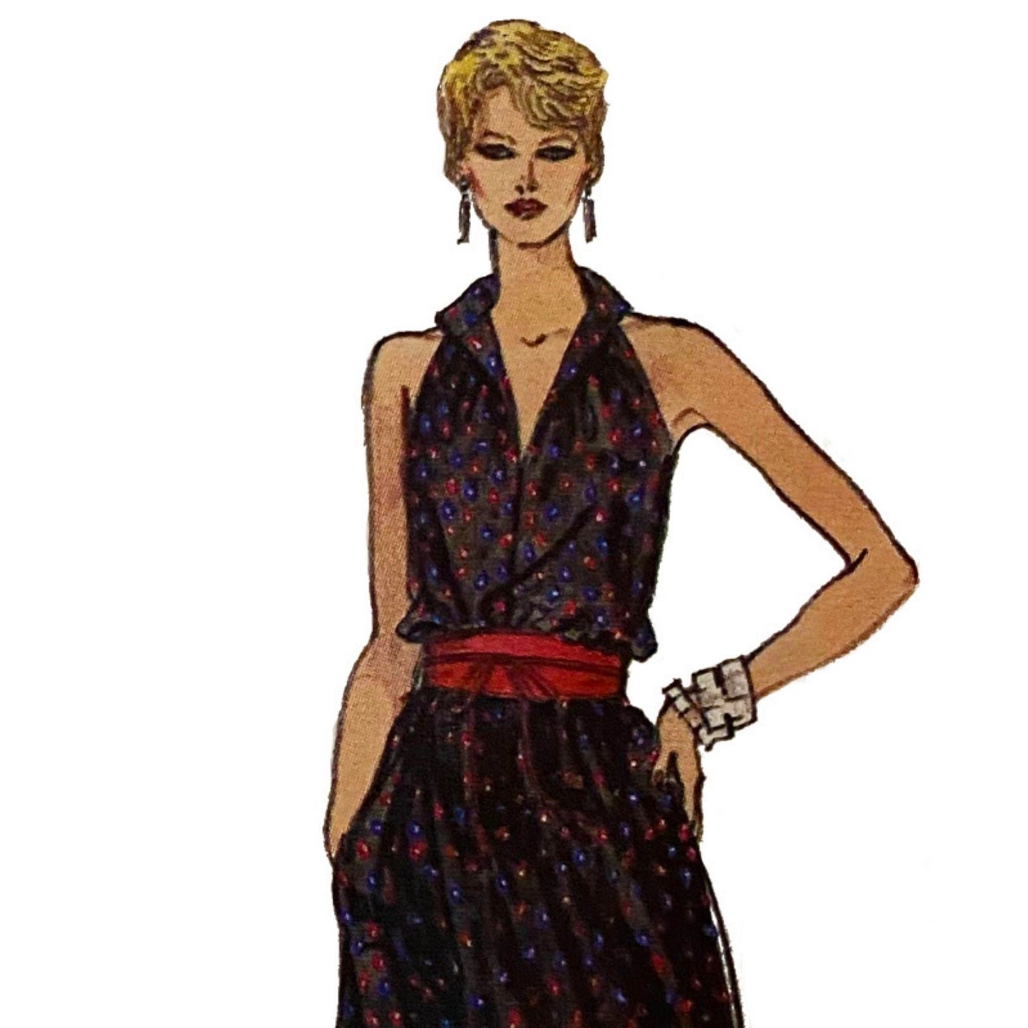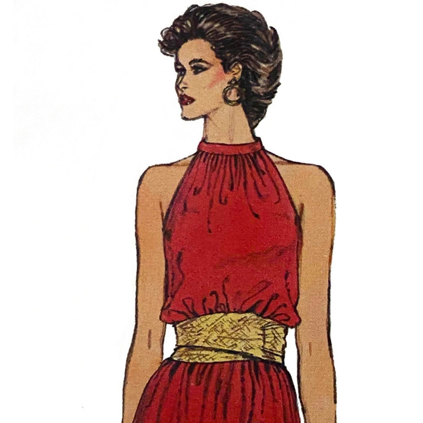 ドレスは膝半ば下 5 インチ (12.5 cm) で、ブルゾンの身頃、フレアスカート、カッタウェイアームホール、伸縮性のあるウエストライン、サイドポケットが付いています。 A: 黒のアウトラインのスリットとバックのボタン付きバンド。 B: シェイプされた襟付きのフロントスリット。購入したベルトたち。説明書はフランス語のほかに英語でも書かれています。 1つのパターンで3つのサイズ