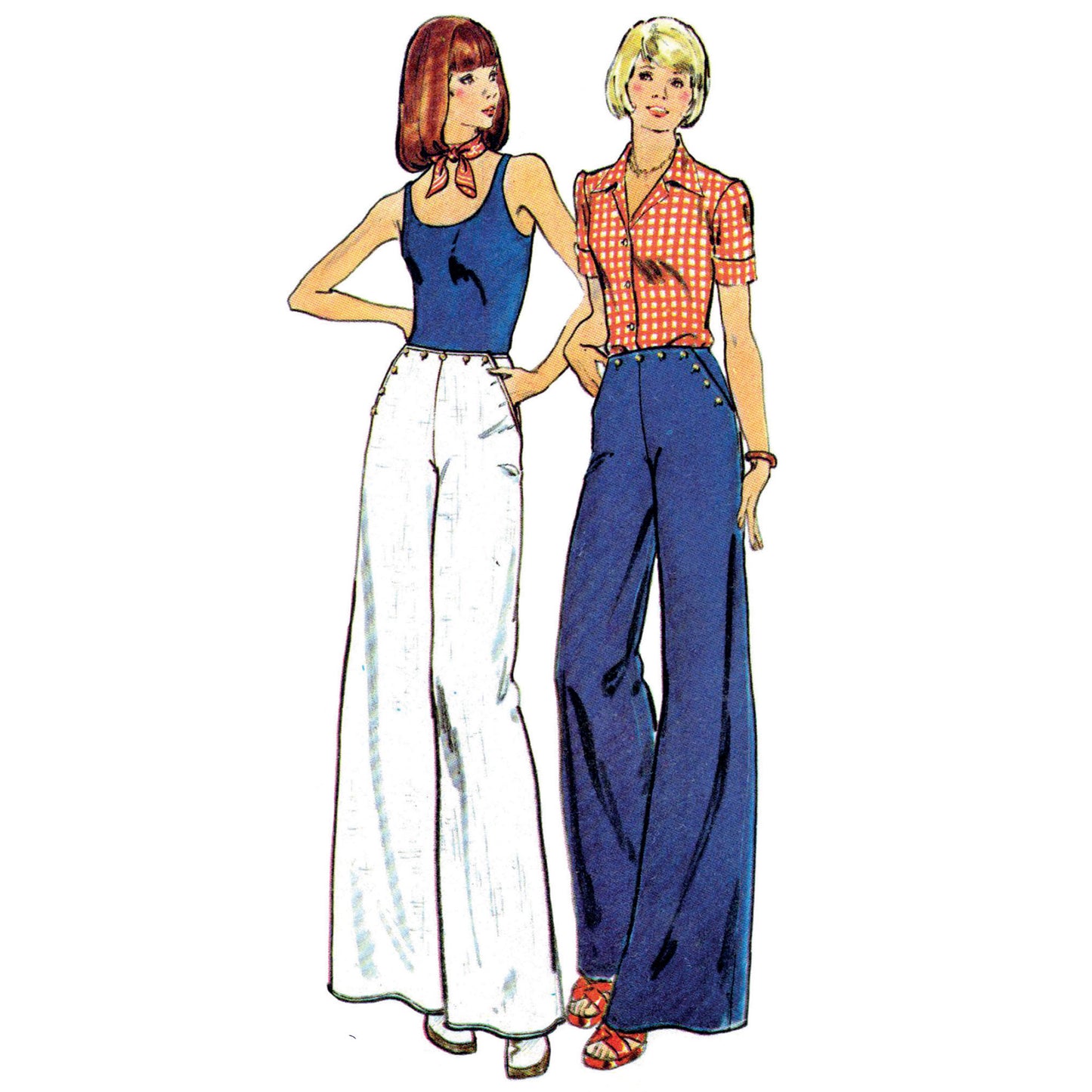 Wijde, uitlopende matrozenbroek met gevormde lage taille, ritssluiting aan de voorkant en klepsluiting met knoop, voorzakken aan de zijkant en sierstiksel. Topjes gekocht.