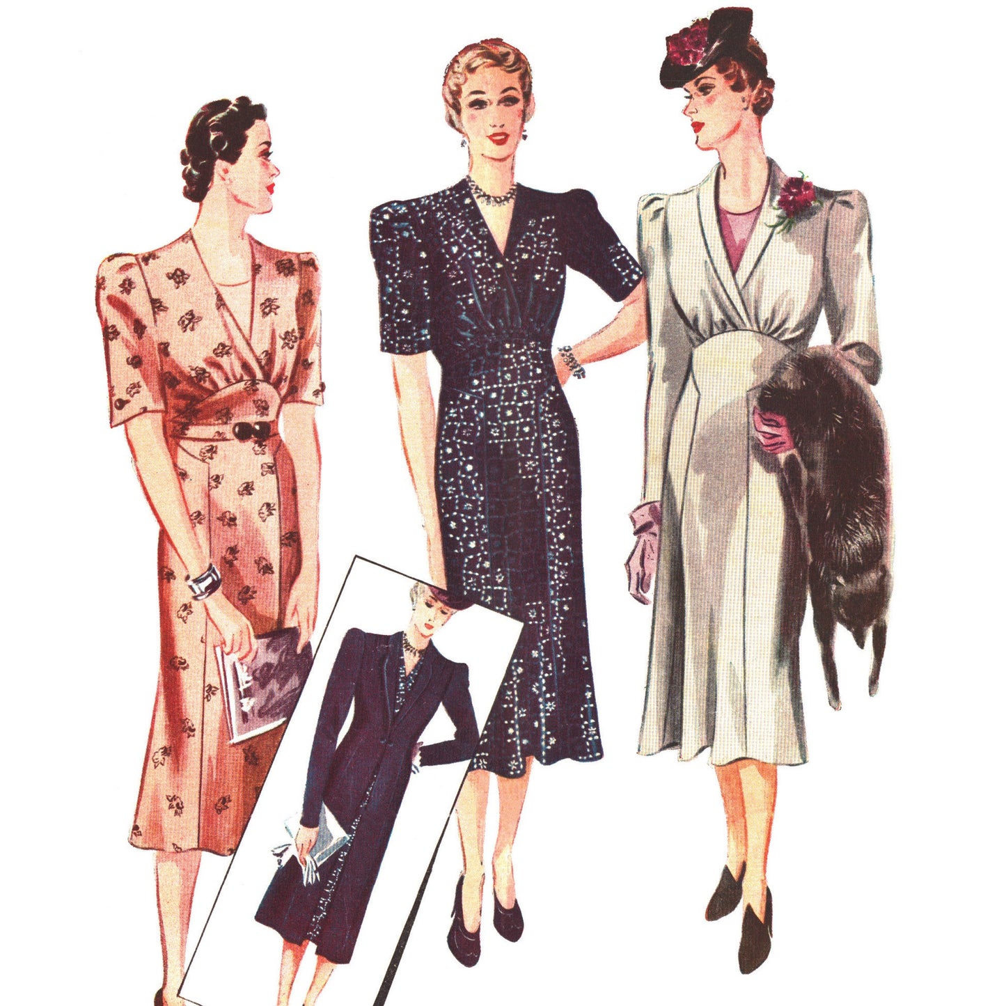 Vær oppmerksom på at kun bystestørrelse er oppgitt på det faktiske mønsteret, og midje- og hoftemål er tatt fra et størrelsesdiagram fra 1930-tallet.