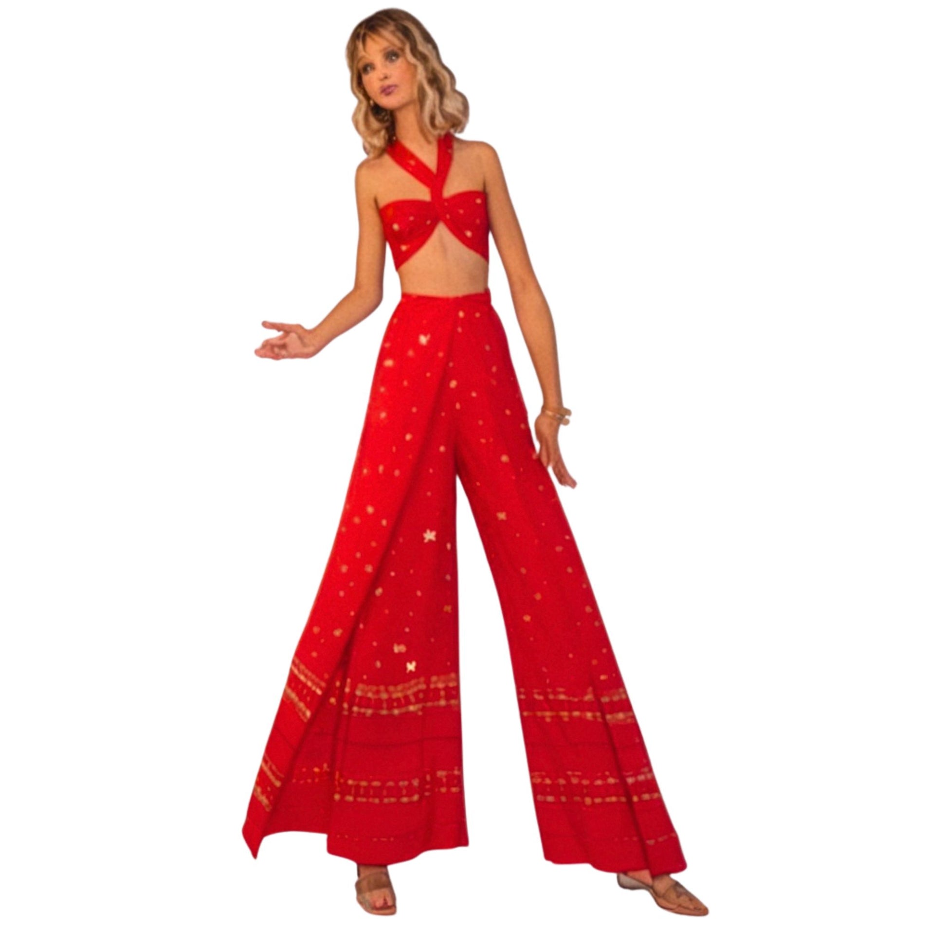 Wrap-And-Go Halter Pantskirt Scarf Top. Wrapped pantskirt, mini or evening length, has elasticized front casing which fastens in back, and draw string back casing which ties in front. With or without ribbon trim. Wrapped scarf halter or purchased top.