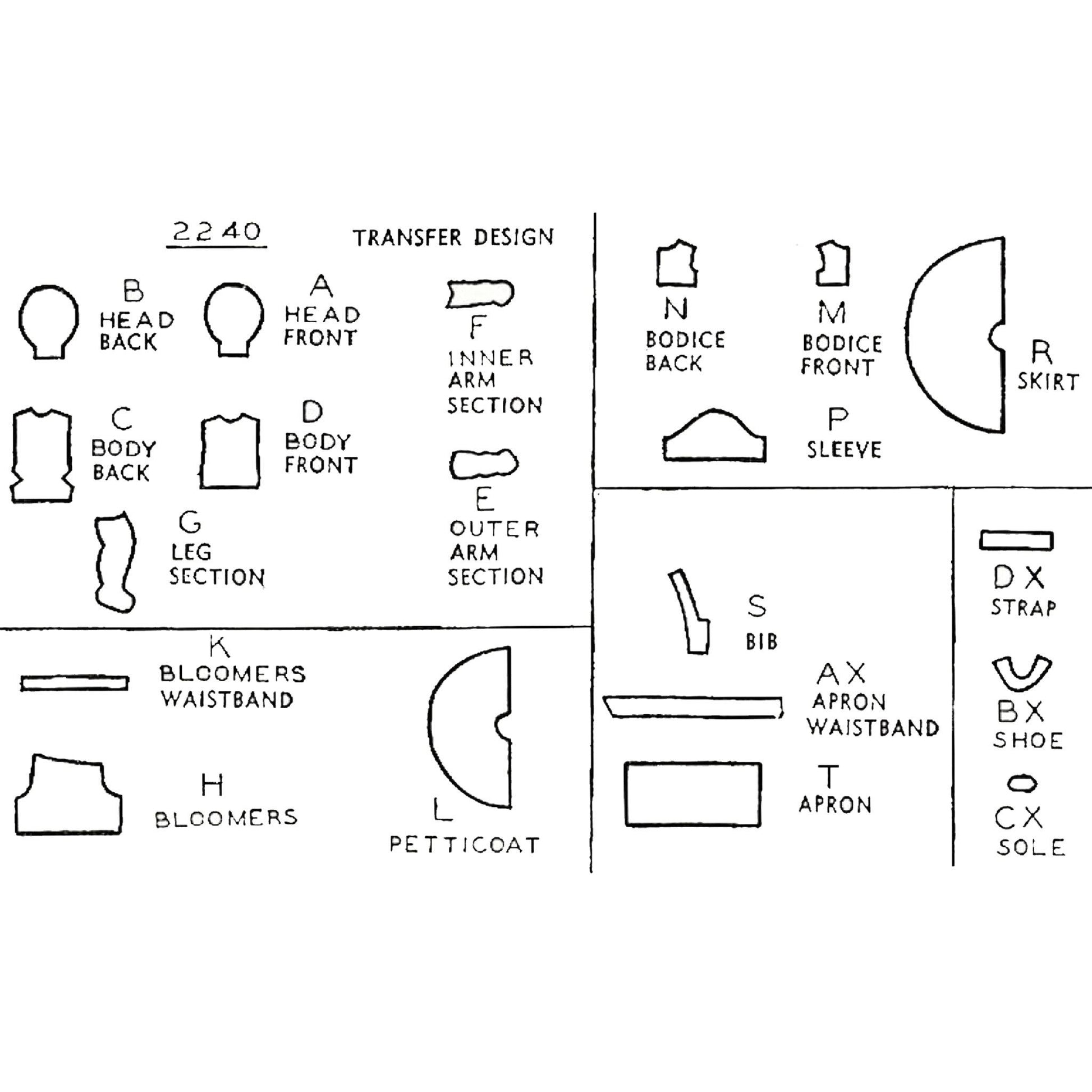 STUFFED DOLL INCLUDING DRESS, APRON, PETTICOAT AND BLOOMERS: The doll is made up of a head, body, legs and arms. Wool is used for the hair. The face, for which a transfer is included, is embroidered, with the exception of the eyes which are appliqued. The bloomers, petticoat, dress, apron and shoes are styled like those of a little girl.