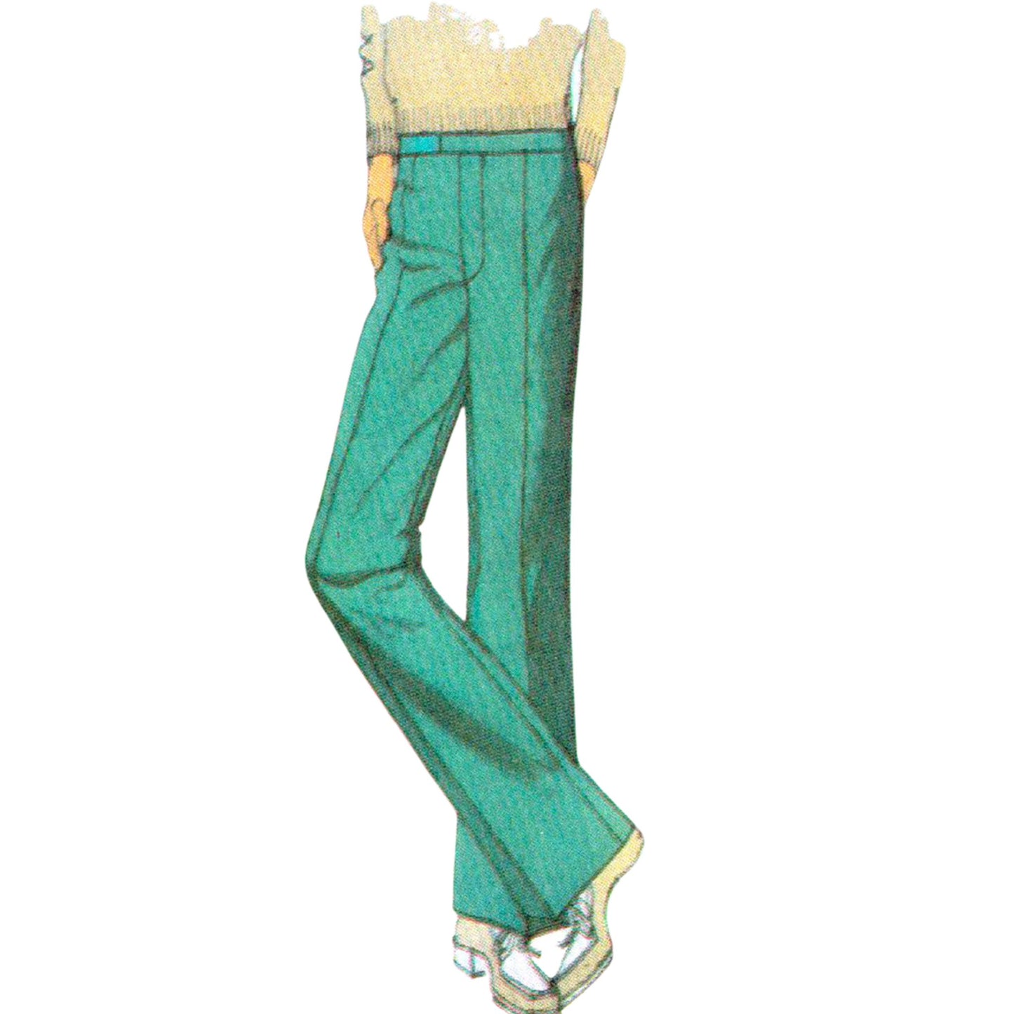 Calças com zíper frontal: possuem cós e bolsos traseiros costurados na parte superior. A vista 1 tem pernas ligeiramente alargadas. A vista 2 tem pernas retas.