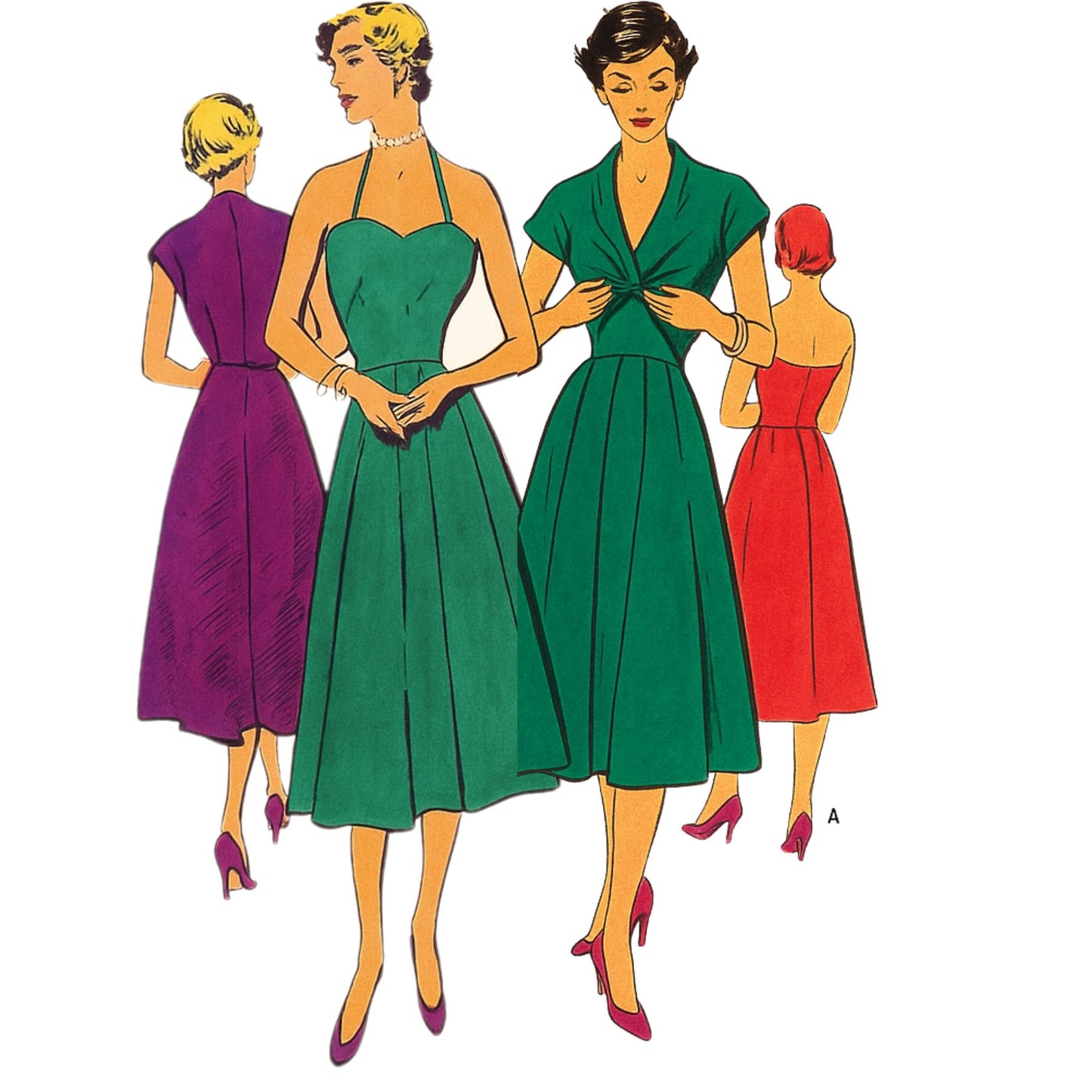 SOLKLÄNNING OCH JACKA. Solklänning med helkjolar har ett kal livstycke med de smalaste grimbanden. Kort, ärmlös jacka som passar till midjan bak, knutar fram för en slående mellanliggande accent. (A) Alla en klänning. (B) Jacka och klänning i kontrast.