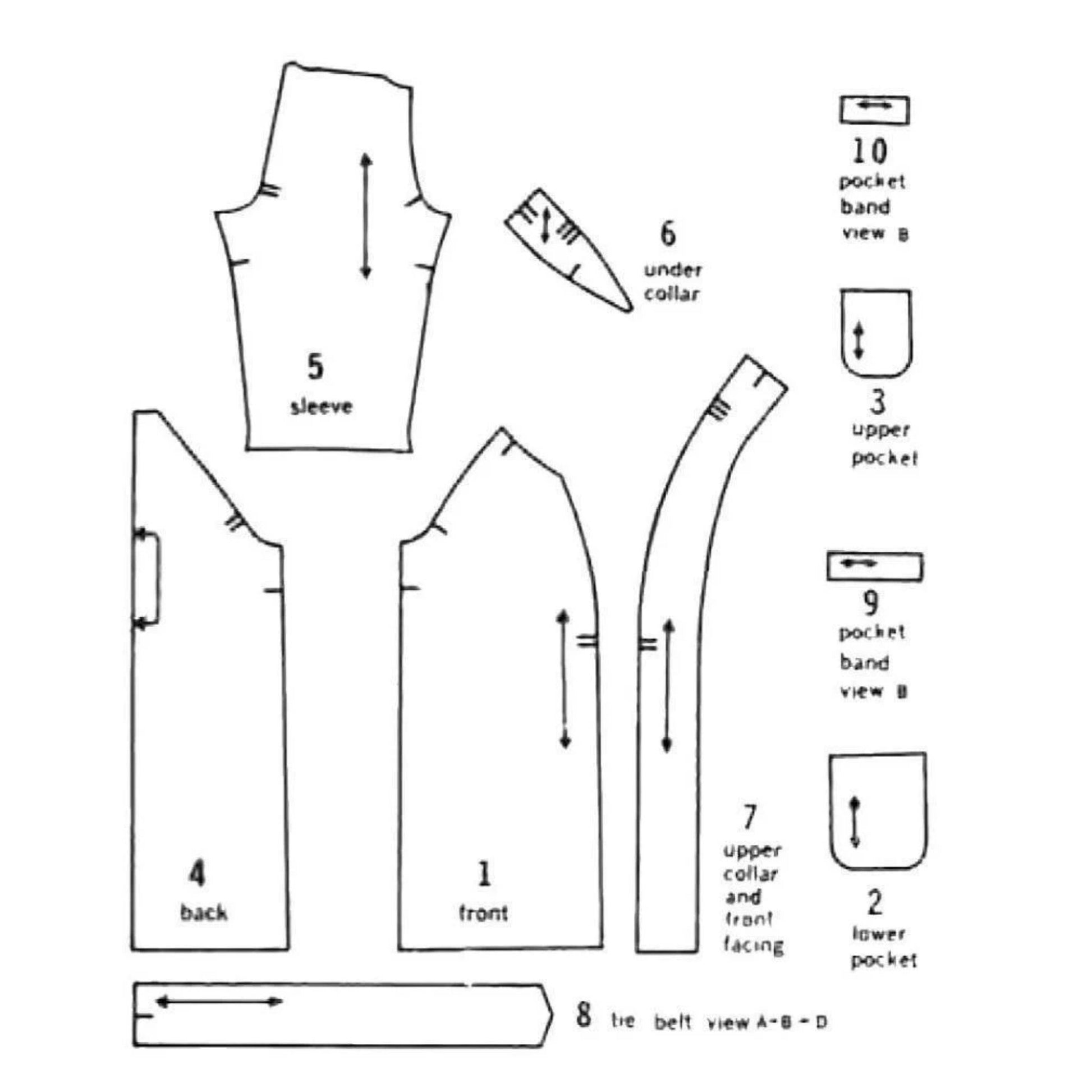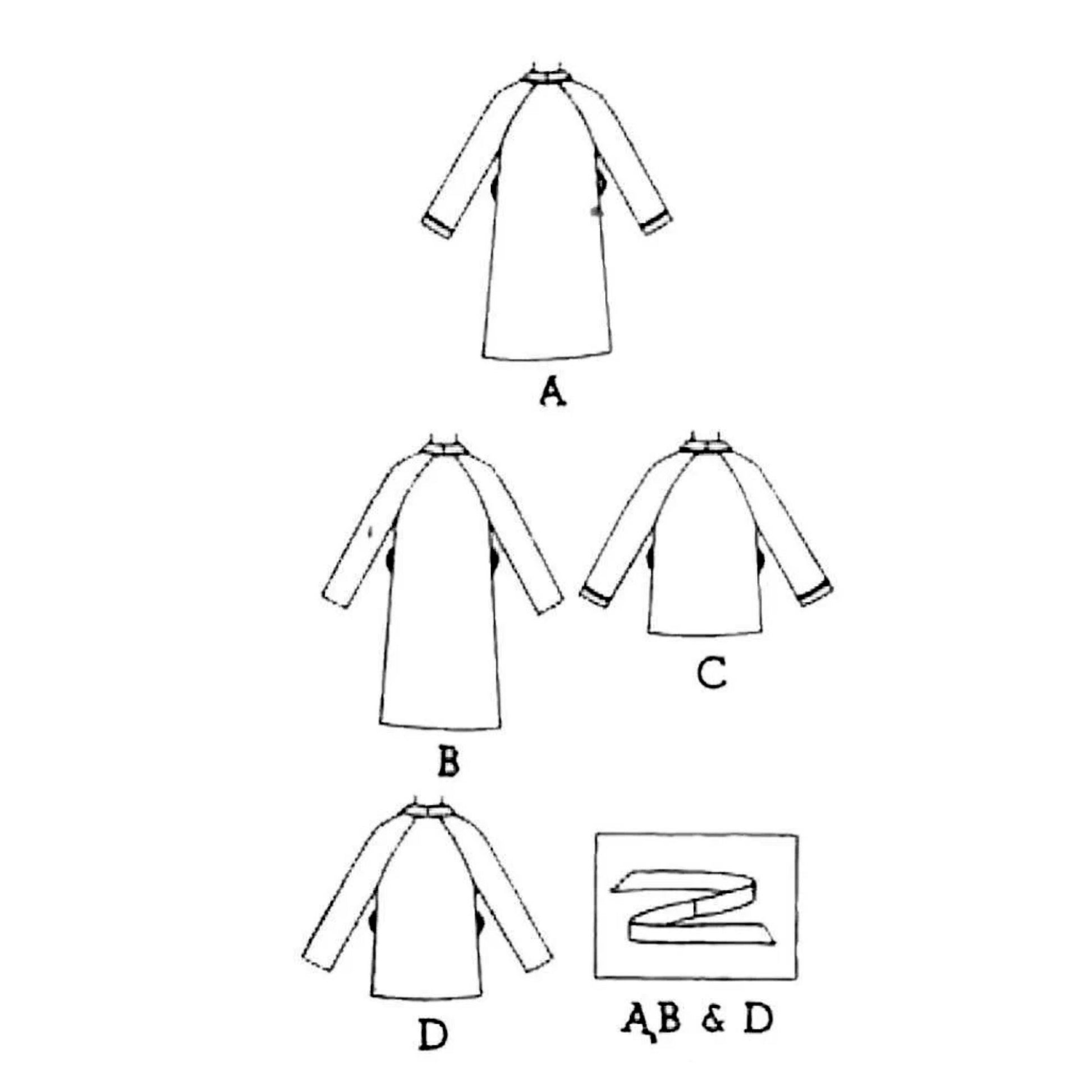 HERRROBE I TVÅ LÄNGDER: Vanlig längd A och B och kortare längd. View C och D "omlottande" klädnader har sjalkrage, lappade fickor, långa ärmar av raglantyp och självtillverkade bärare. Robe View A, B och D har självtillverkade bälten. Vy A och C har runda flätade trim. Vy B med kontrasterande fickband och krage kan bäras med snörband. View C har snörband.